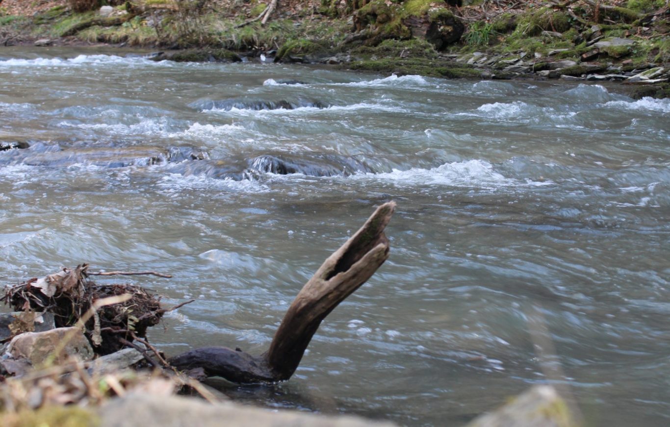 Am Ende des Pfades wenden wir uns nach rechts und wandern nun gemütlich über federnden Waldboden Richtung Gelbachtal. Am Otto-Wolff-Stollen erfahren wir einiges über die dort lebende Fledermaus-Population und marschieren dann talabwärts zum Gestade des Gelbachs, der rauschend durch das Bachtal fließt.