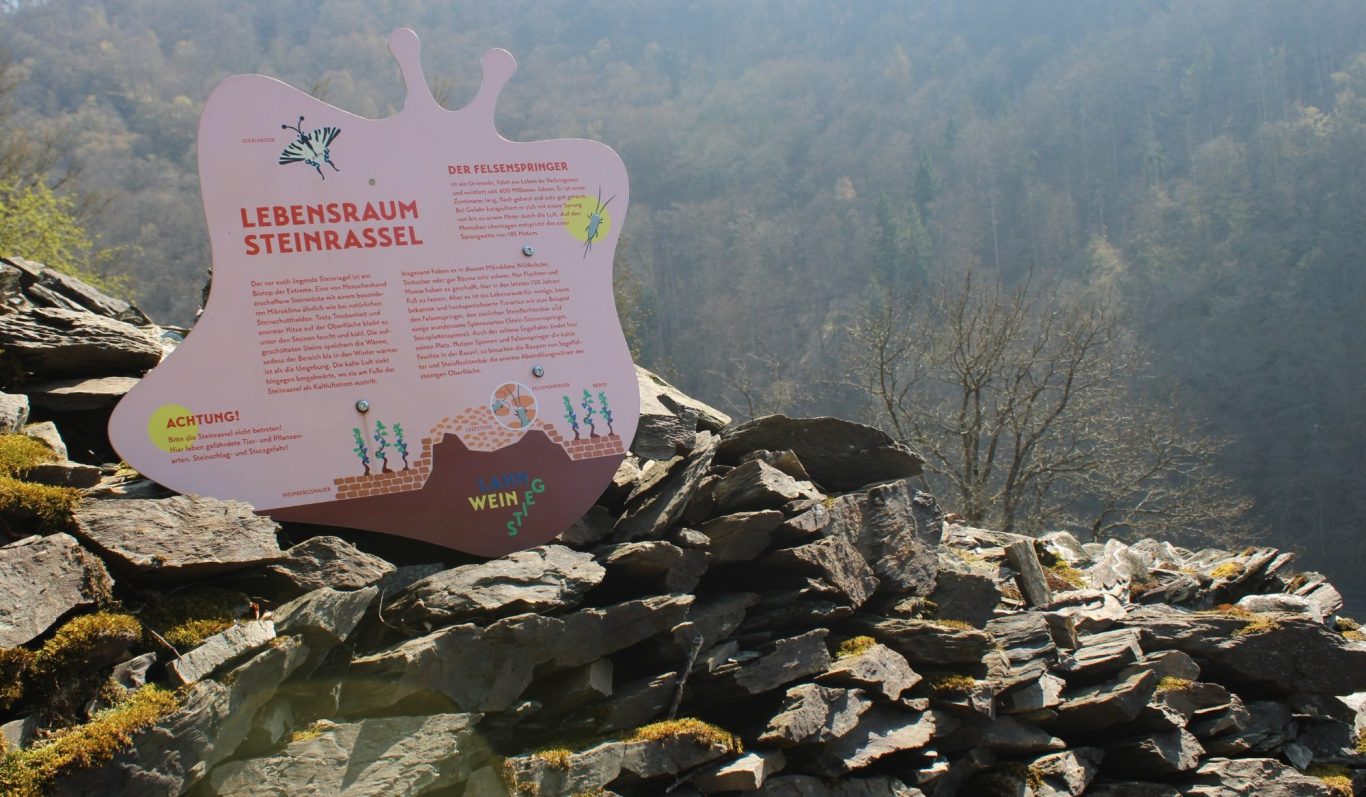 Neben einem steinernen Trullo – (Ihr erinnert euch an den Trullo in Rheinhessen?) – finden sich im Aufstieg immer wieder nette und informative Tafeln. So können wir an der „Echotafel“ unser Echo über das Lahntal hinweg hören und an der Wärme spendenden Steinrassel erfahren wir wissenswerte Details der hiesigen Flora und Fauna.