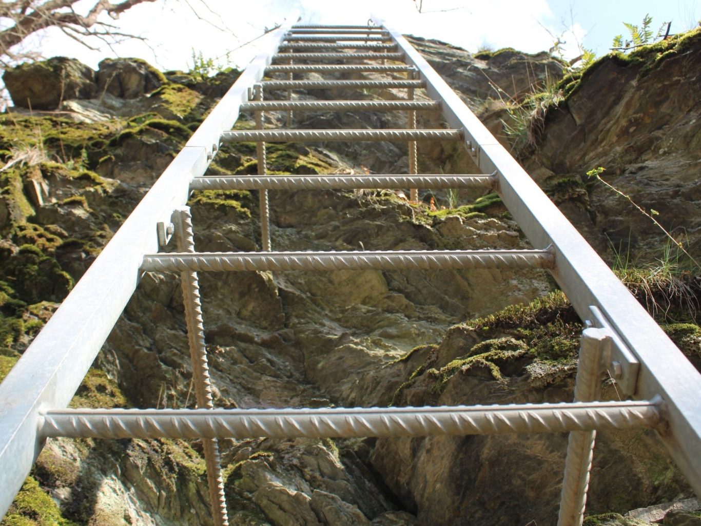 200 Meter steil hinauf heißt die Devise. Dazu kraxeln wir über steil abfallende, felsige Pfade und müssen eine hohe Stahlleiter hinaufsteigen, die mir mit meiner Höhenangst einen Heidenrespekt abverlangt.