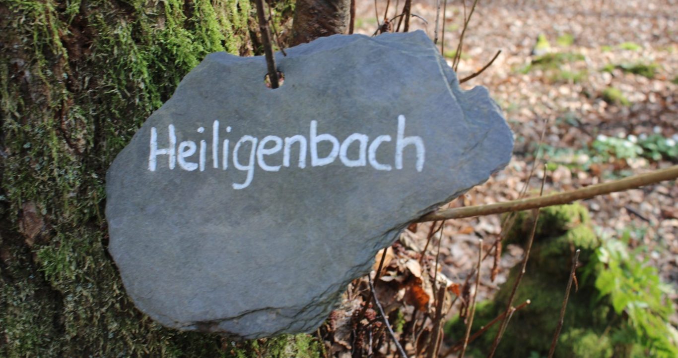 Dem Wegesymbol folgend nehmen wir kurz nach der Florianshütte den rechten Abzweig Richtung Forsthaus, ziehen dann über Wiesenwege zur „Kleinen Kapelle“ und wandern mit der Wegegemeinschaft von Langhalsweg und Rheinsteig weiter. Nach erstmaliger Überquerung des „Hinnerschtbachs“ ziehen wir wenig später über den Landsberg durch das Tal des Heiligenbachs.