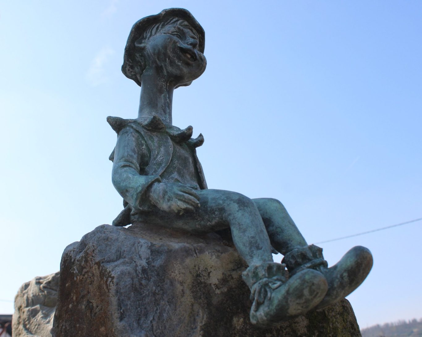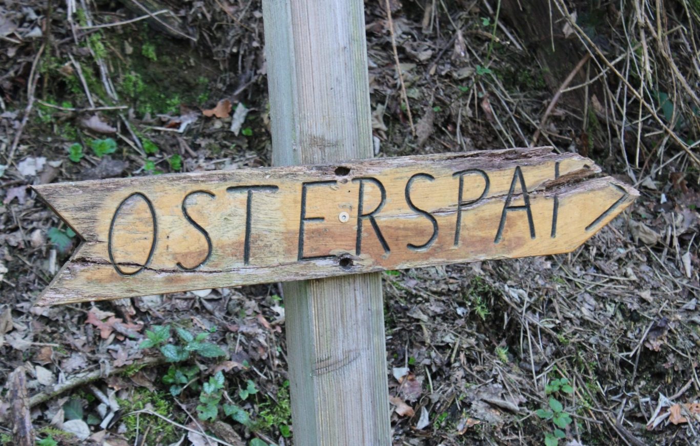 Mit einem verschmitzten Lachen empfängt uns die Bronzeskulptur des niedlichen „Osterspaier Langhals“ auf dem Dorfplatz. Noch sind wir scheinbar die ersten Wandersleut, die heute die Route des Wanderweges abschreiten möchten. Die Sonne scheint und die Temperaturen bieten ideales Wanderwetter.
