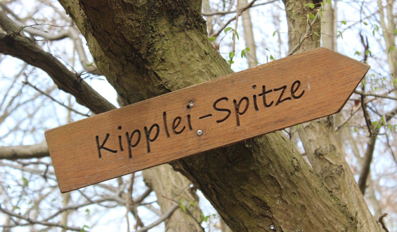 Nach dem Anstieg ist der „abenteuerlichste“ Teil der Tour fast geschafft. Leicht bergab weist ein hölzernes Ortsschild die maßgebliche Gehrichtung an.