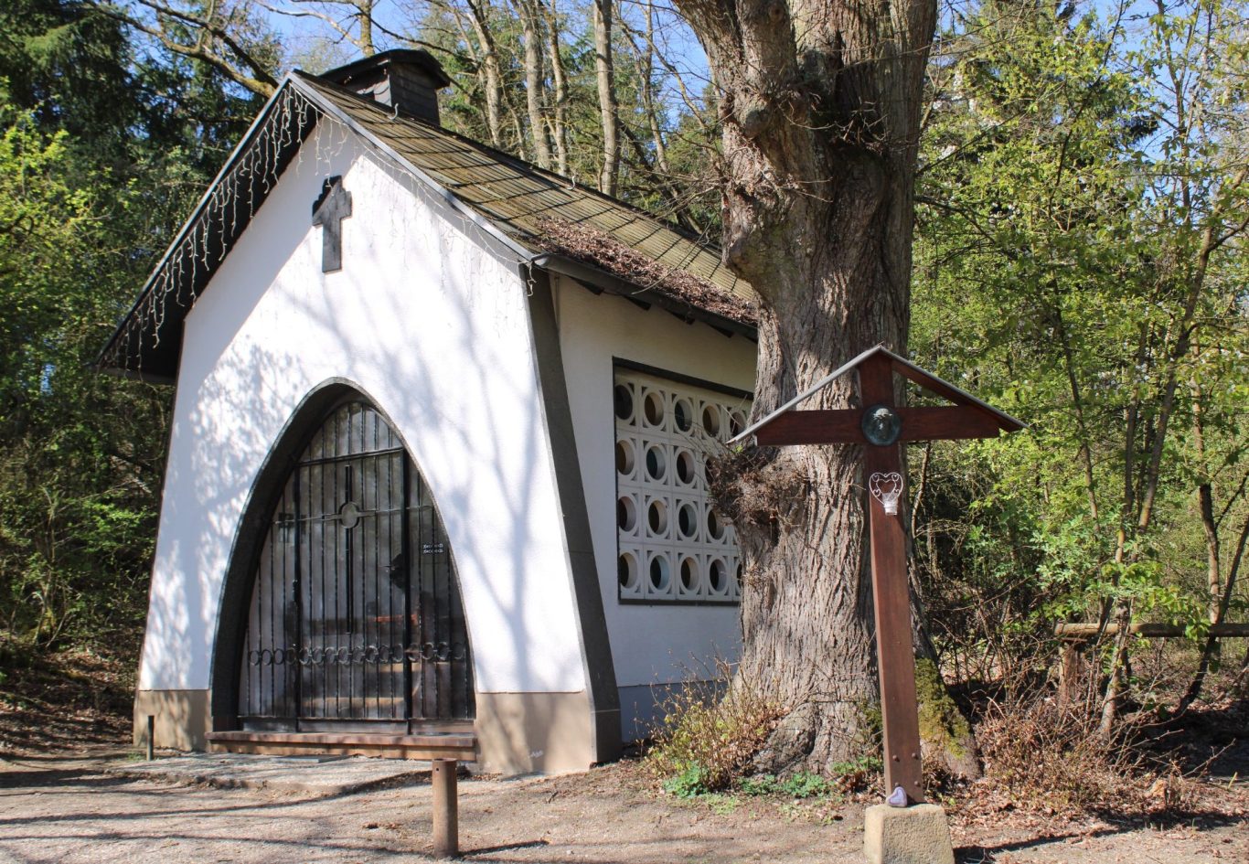 Auf einem kleinen Pfad, neben einem breiten „Hauptweg“, erreichen wir schließlich die Bergkapelle am Trumbster Weg. Die kleine Kapelle lädt zu einer besinnlichen kleinen Pause ein.